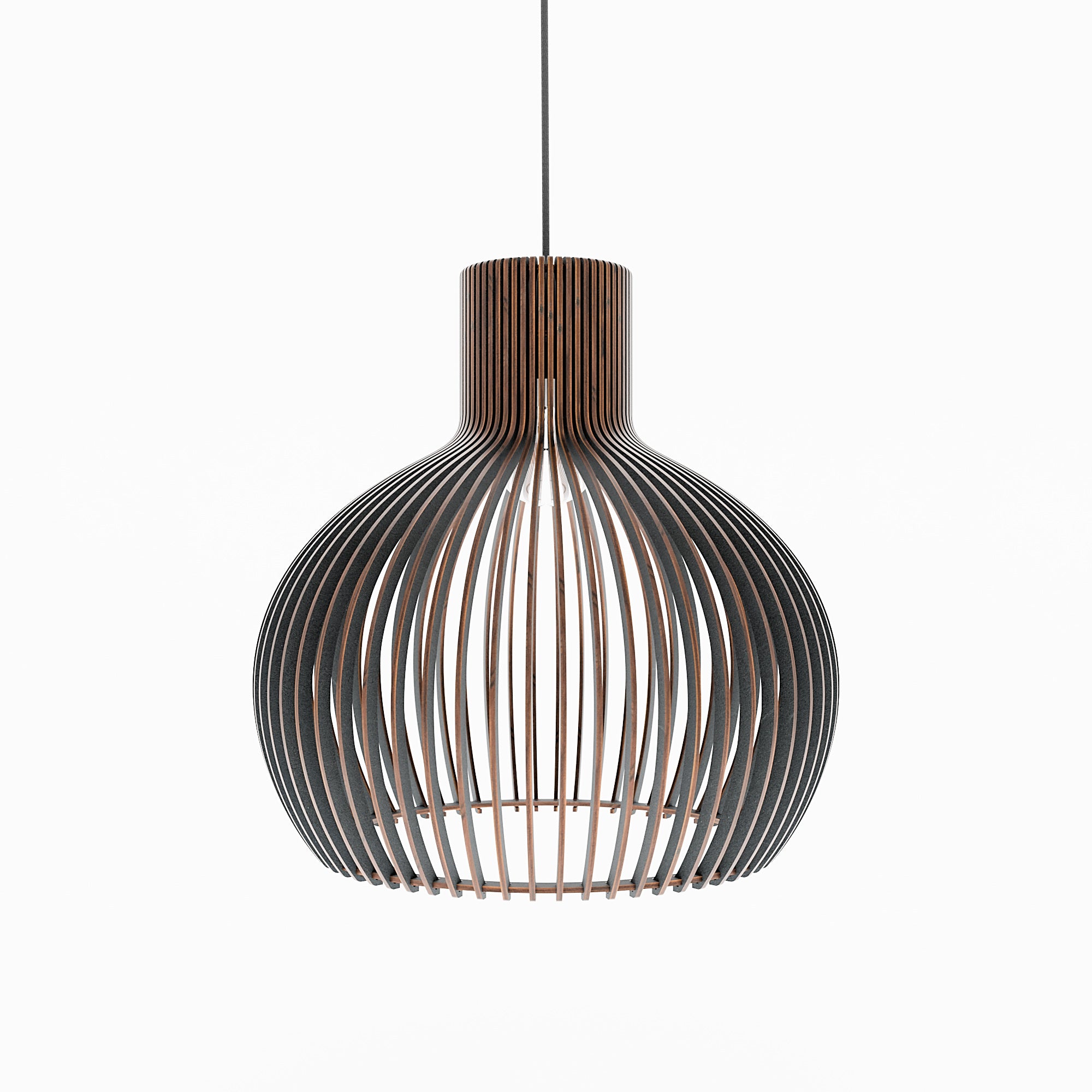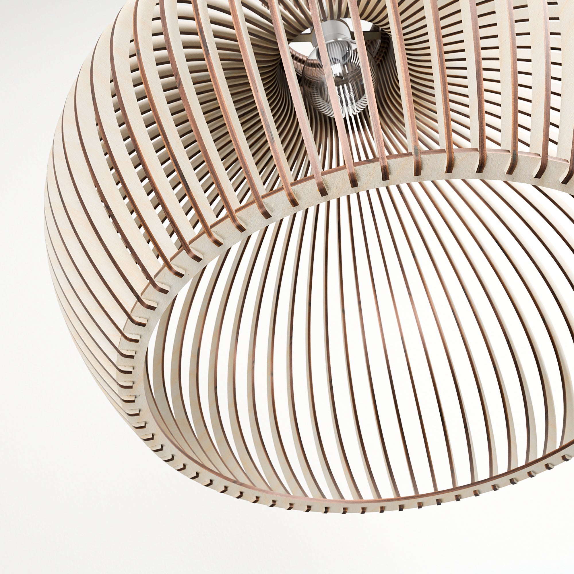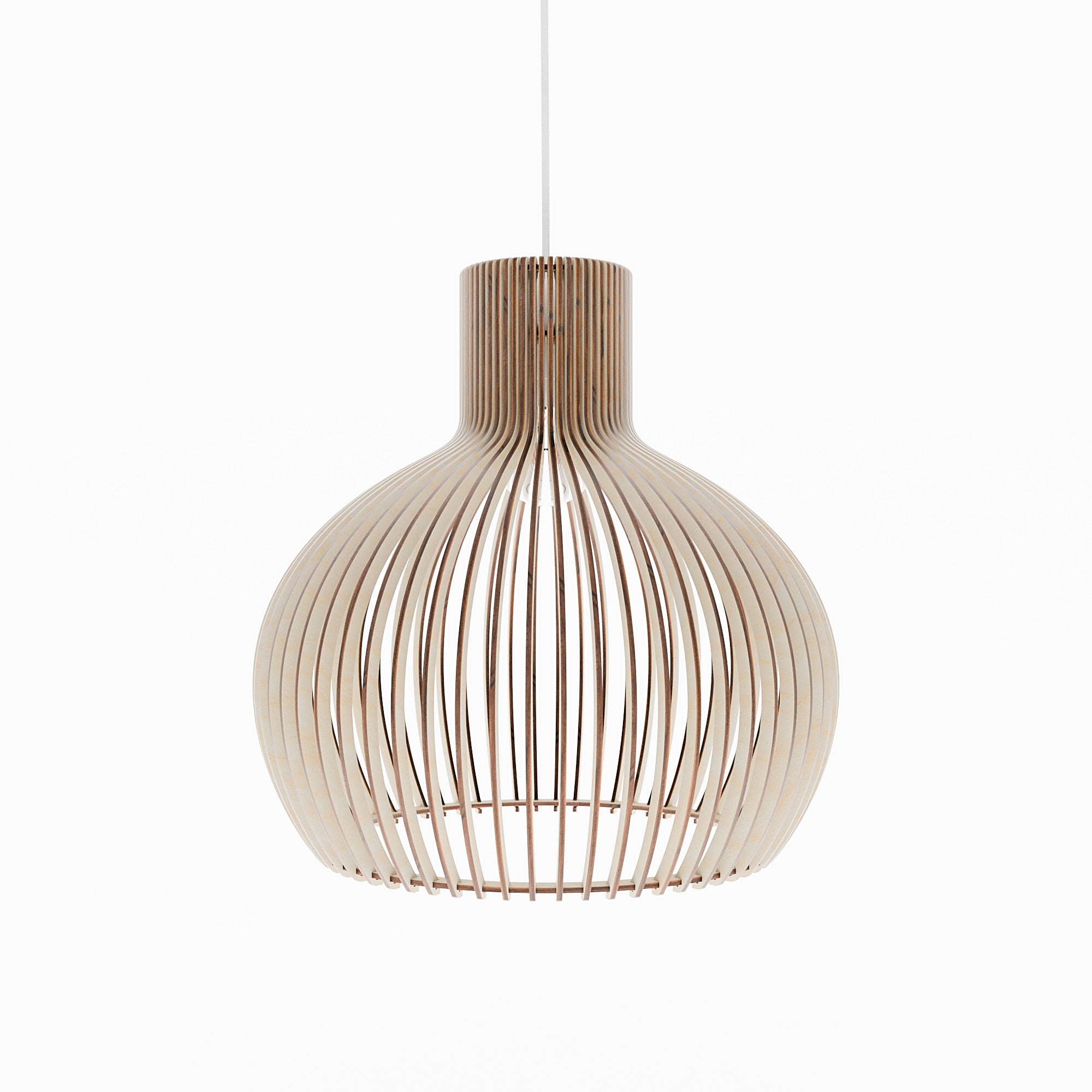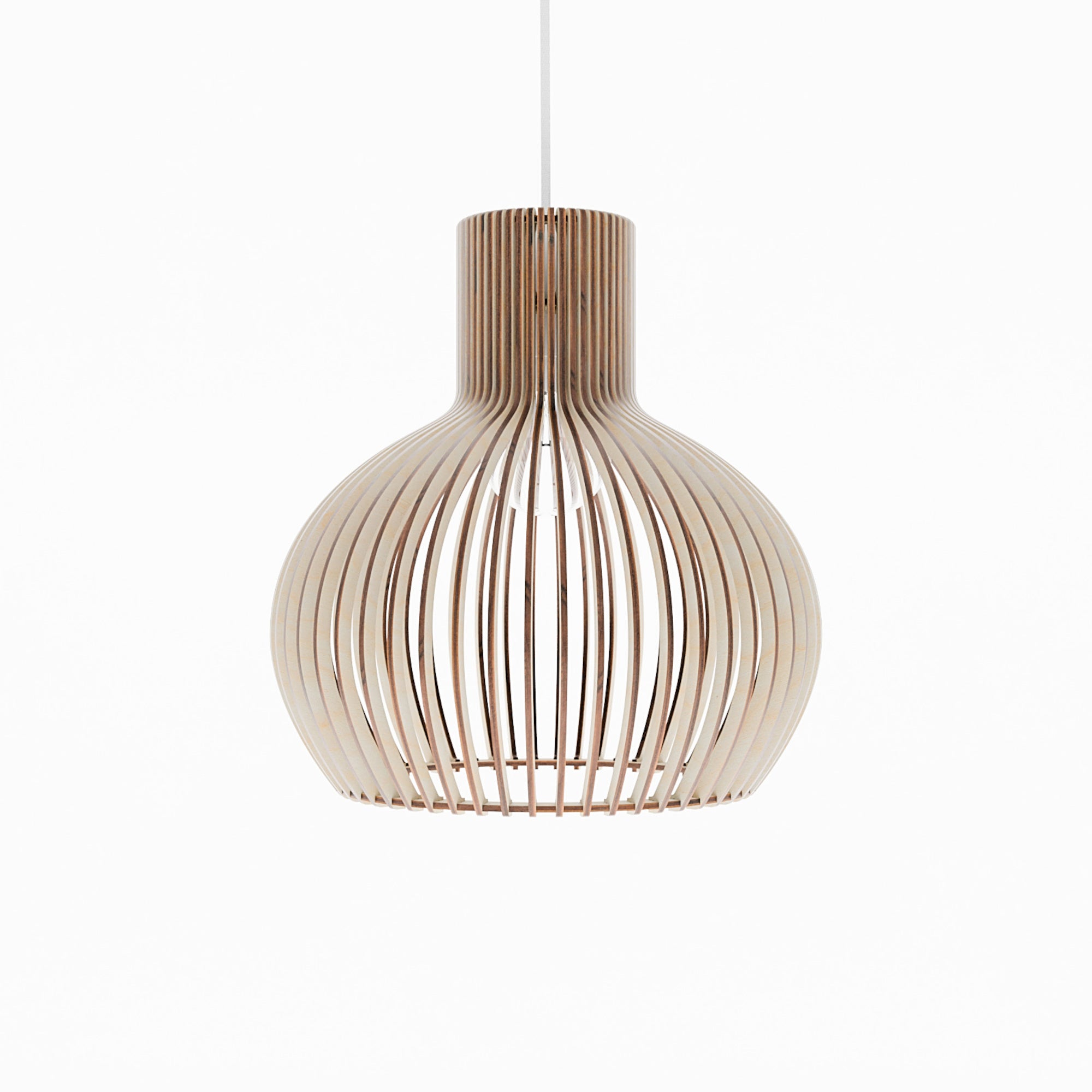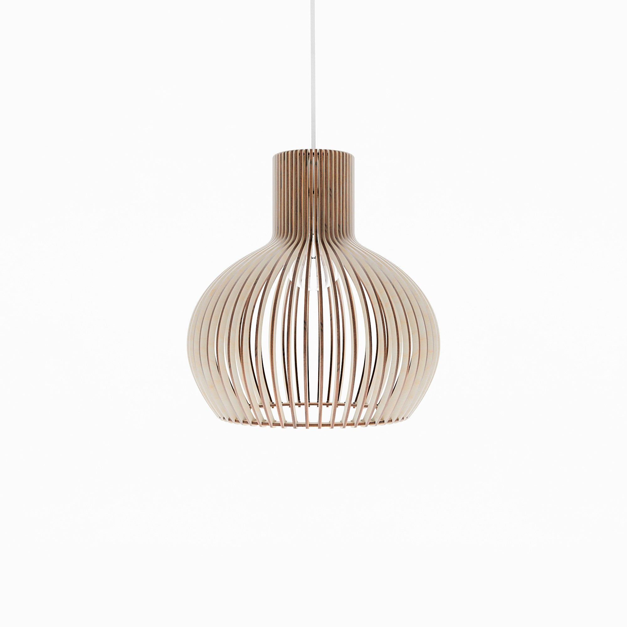 Im beleuchteten Zustand streut die geschwungene Holzkonstruktion das Licht gleichmäßig und erzeugt ein weiches, umfassendes Leuchten mit sanften Schattenlinien zwischen den einzelnen Elementen. Die ausgewogene Form lässt das Licht natürlich streuen, was zu einer ruhigen und harmonischen Atmosphäre führt. Im unbeleuchteten Zustand wirkt die Lampe wie ein skulpturales Volumen, definiert durch ihre sanften Rundungen und ihre rhythmische Struktur. Ihre Präsenz bleibt weich und doch markant und verleiht dem Interieur einen stillen Charakter.