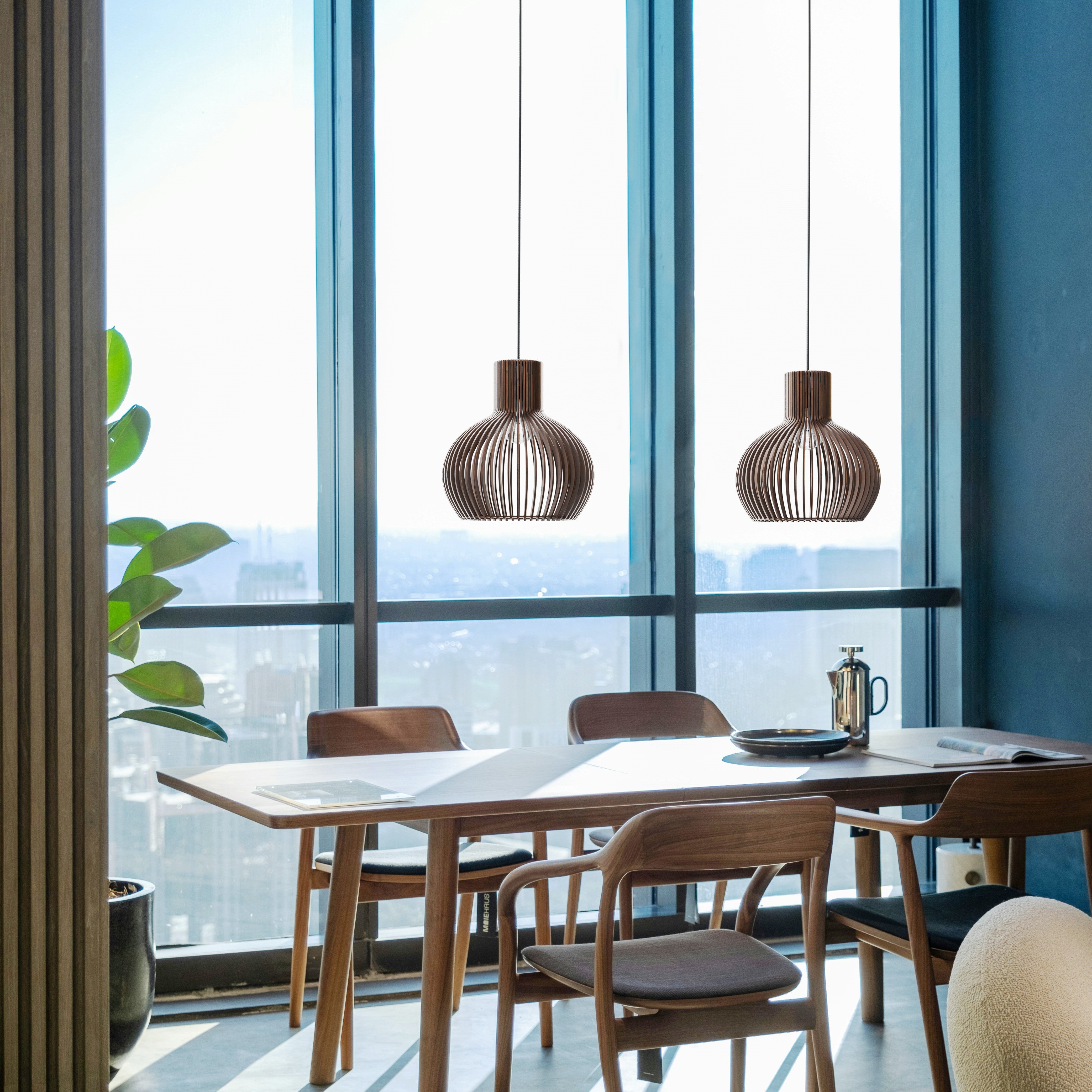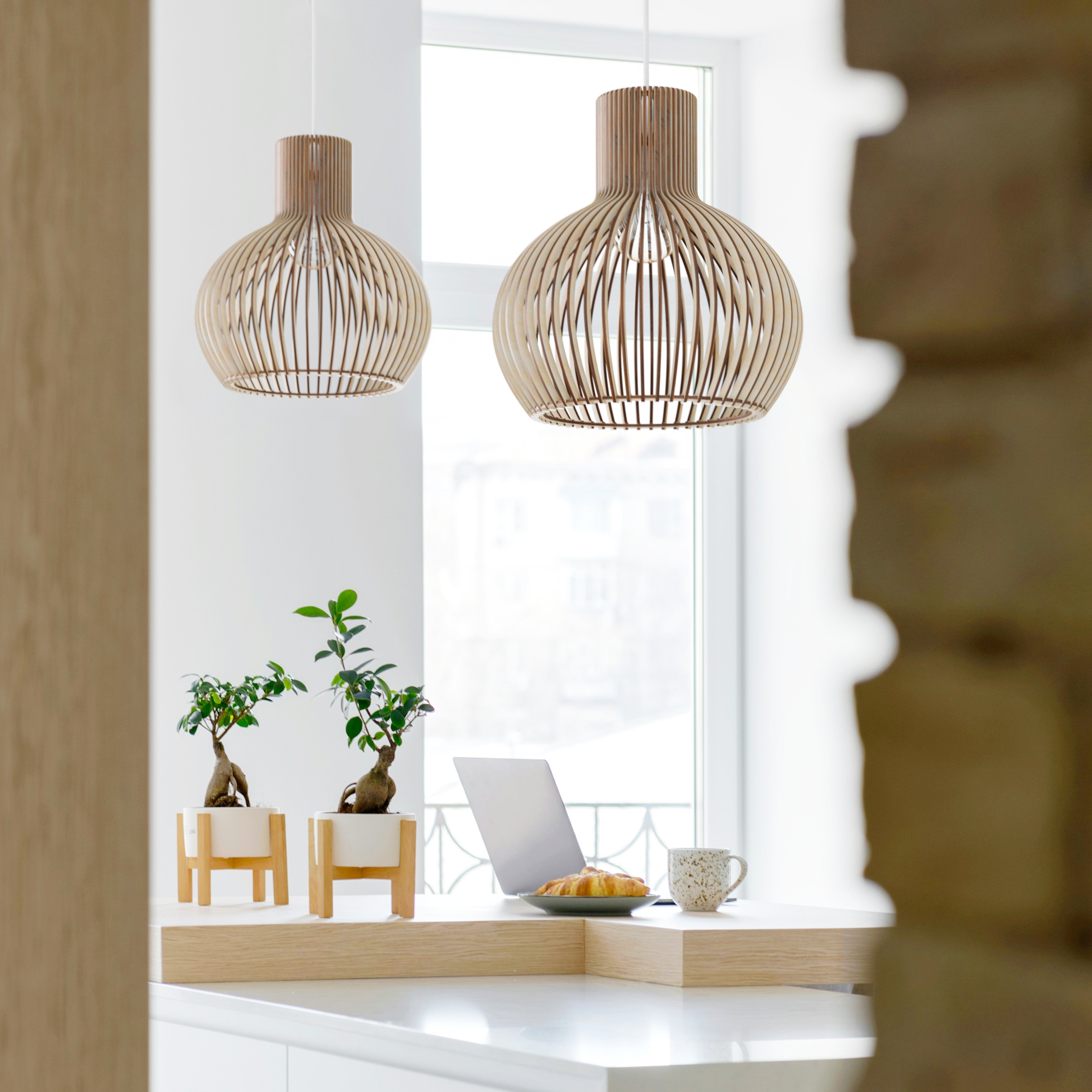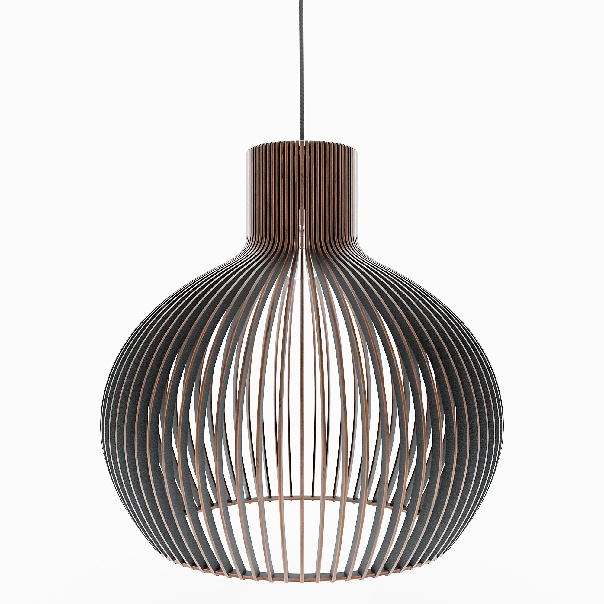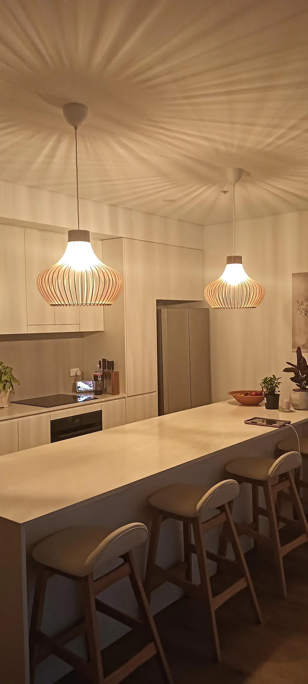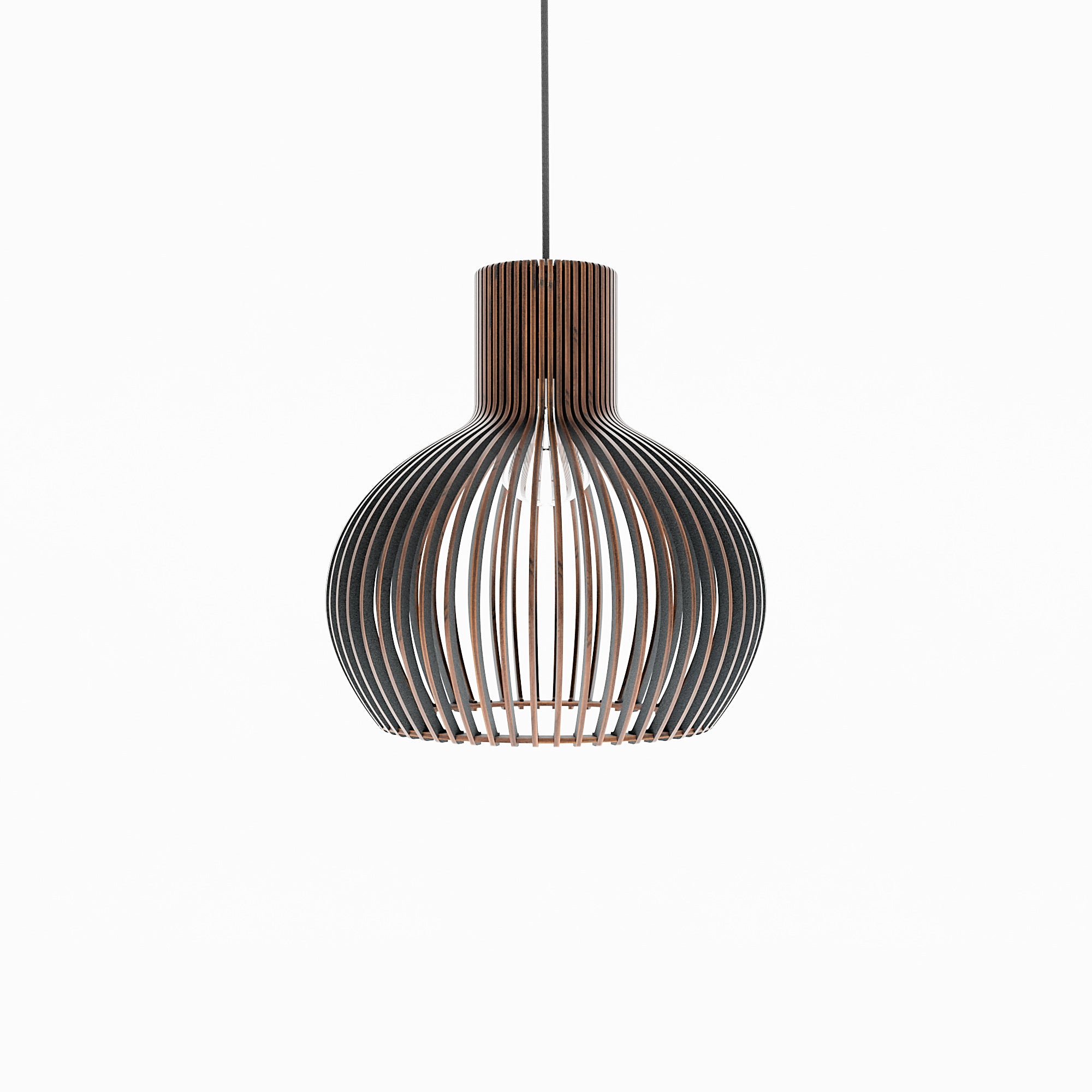 Im beleuchteten Zustand streut die geschwungene Holzkonstruktion das Licht gleichmäßig und erzeugt ein weiches, umfassendes Leuchten mit sanften Schattenlinien zwischen den einzelnen Elementen. Die ausgewogene Form lässt das Licht natürlich streuen, was zu einer ruhigen und harmonischen Atmosphäre führt. Im unbeleuchteten Zustand wirkt die Lampe wie ein skulpturales Volumen, definiert durch ihre sanften Rundungen und ihre rhythmische Struktur. Ihre Präsenz bleibt weich und doch markant und verleiht dem Interieur einen stillen Charakter.