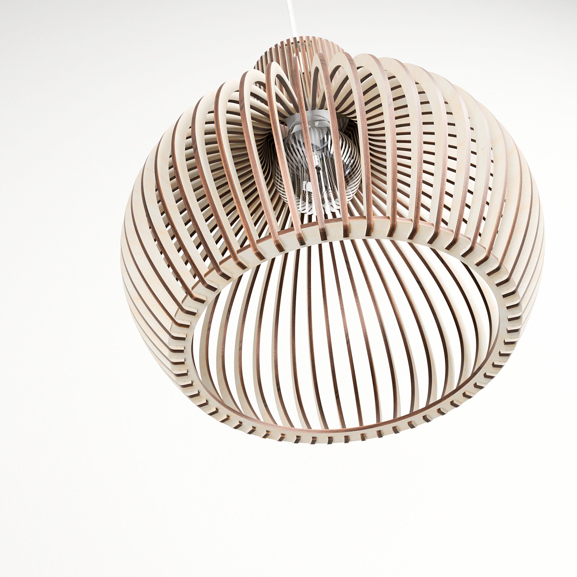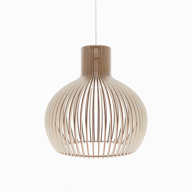 Entwickelt, um Wärme und Ausgeglichenheit in moderne Innenräume zu bringen, hebt diese Holz-Pendelleuchte die stille Schönheit natürlicher Materialien hervor. Ihre skulpturale Form streut das Licht sanft und schafft eine ruhige und einladende Atmosphäre, während sie eine saubere architektonische Wirkung behält.